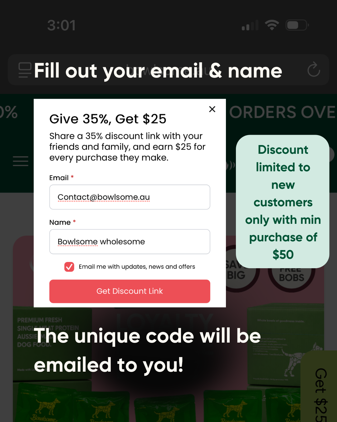 Share your unique Bowlsome code with your followers and give them 35% off their first order (min order $50).