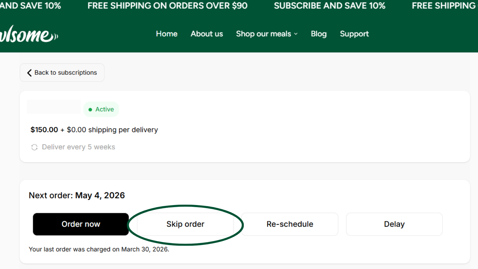 How do I skip a subscription order?Updated 7 days ago